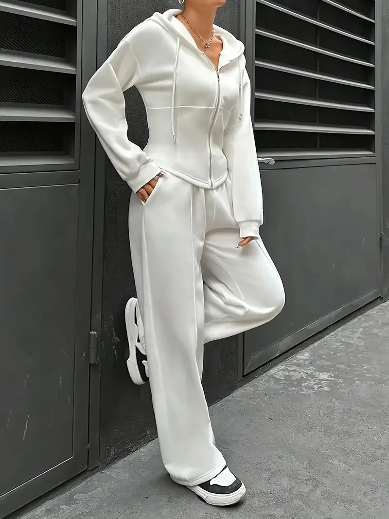 [All Seasons Polyester Hooded Tracksuit] Women'S Elegant Solid Color Polyester Hooded Tracksuit Set with Drawstring and Zipper Details – Knit Fabric Pantsuit for All Seasons