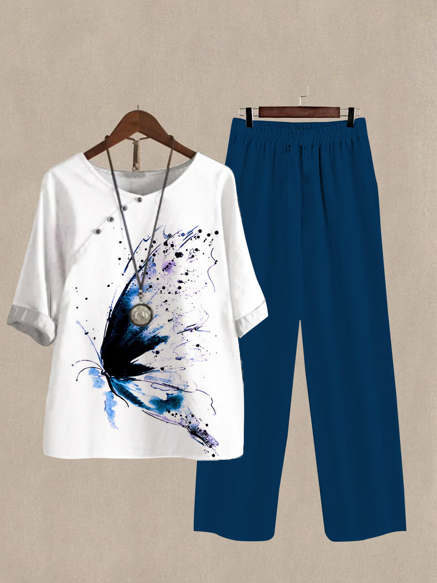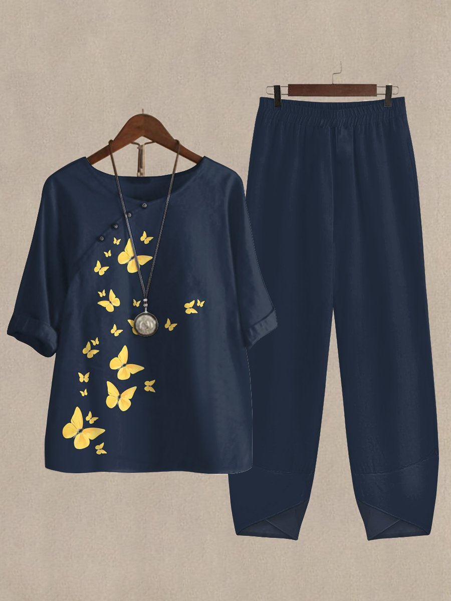 Linen Casual Women's Butterfly Print Two Pieces Set