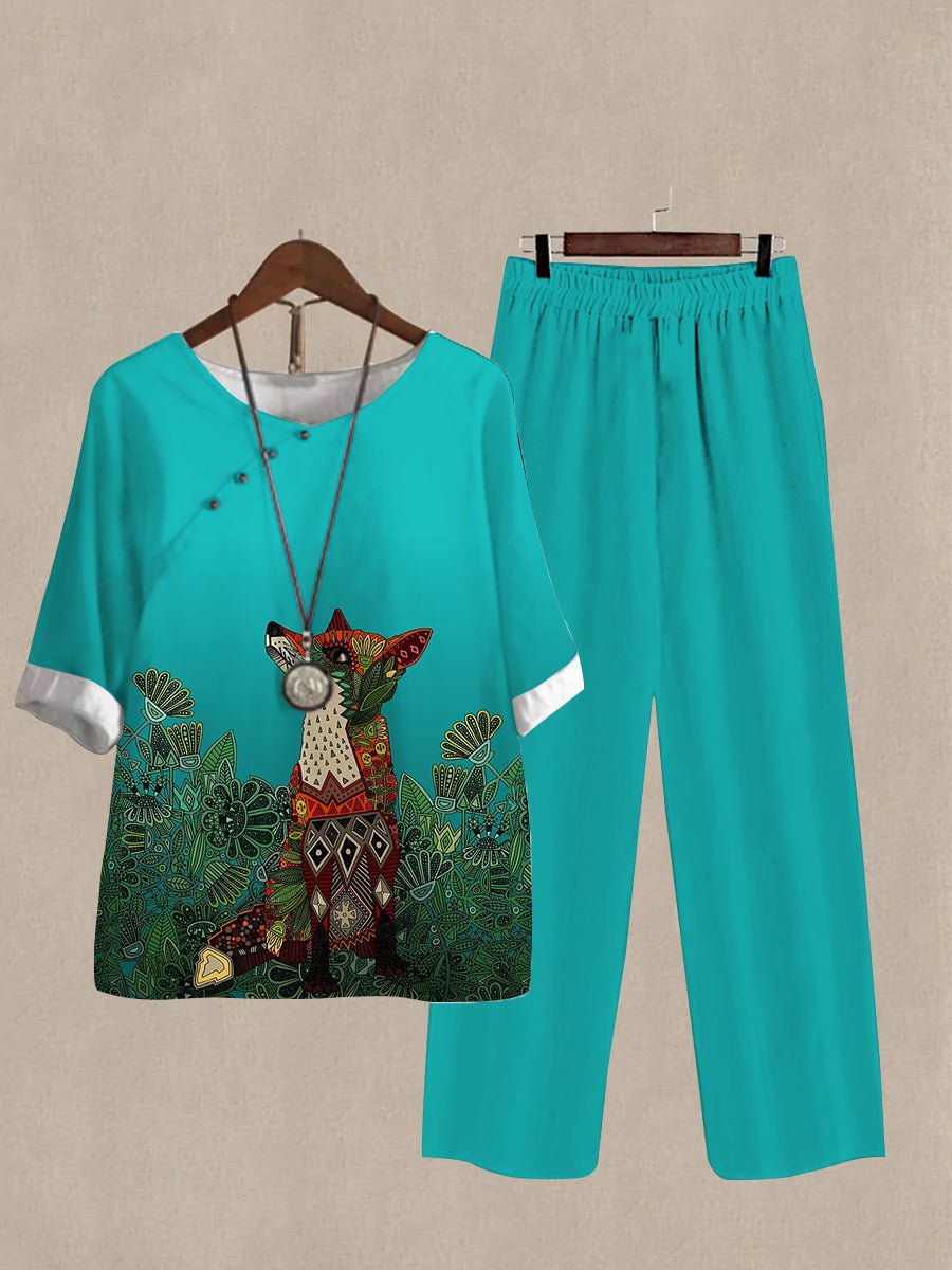 Women's Fox Print Half Sleeve Top And Wide Leg Pants Linen Two Pieces