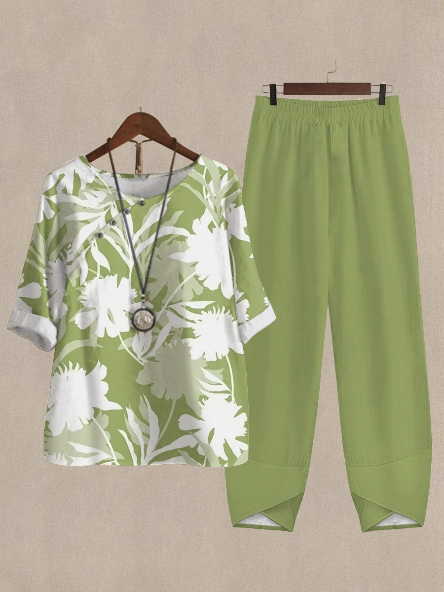 Linen Casual Women's Floral Print Two Pieces Set