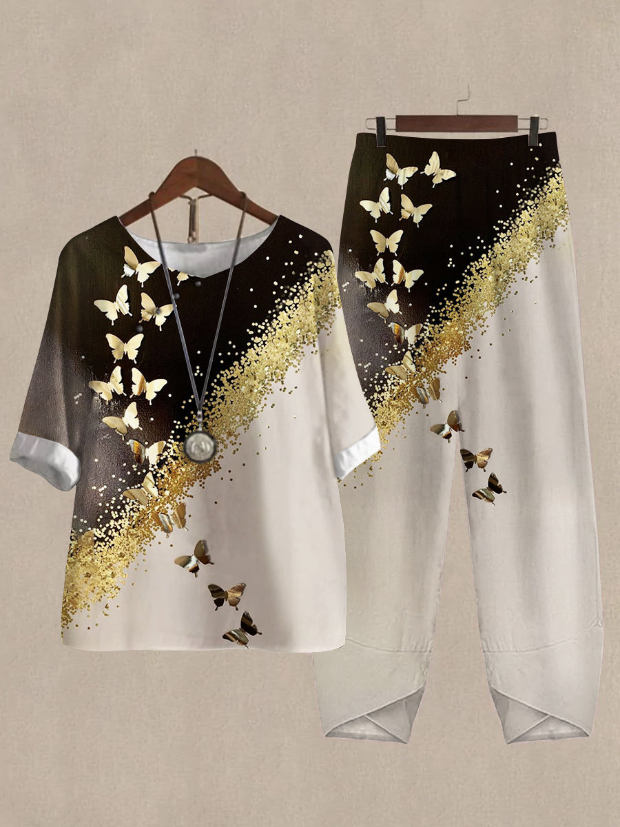 Linen Casual Women's Gold Butterfly Print Two Pieces Set