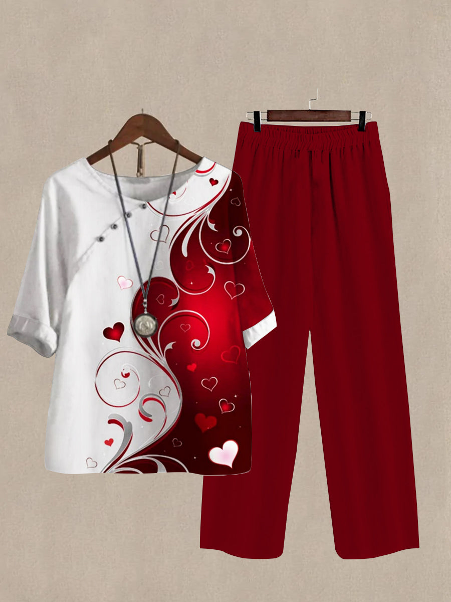 Women's Floral Heart Print Half Sleeve Top And Casual Pants Linen Two Pieces