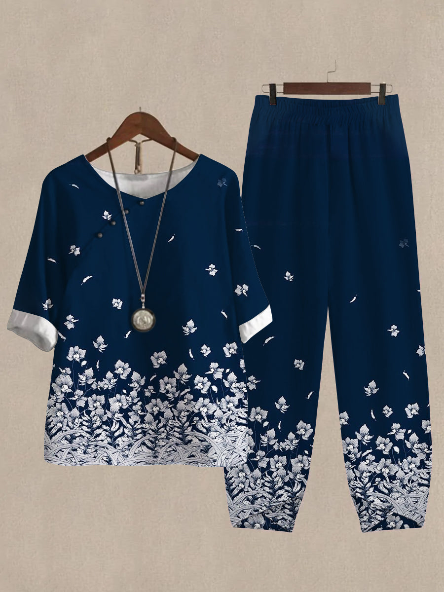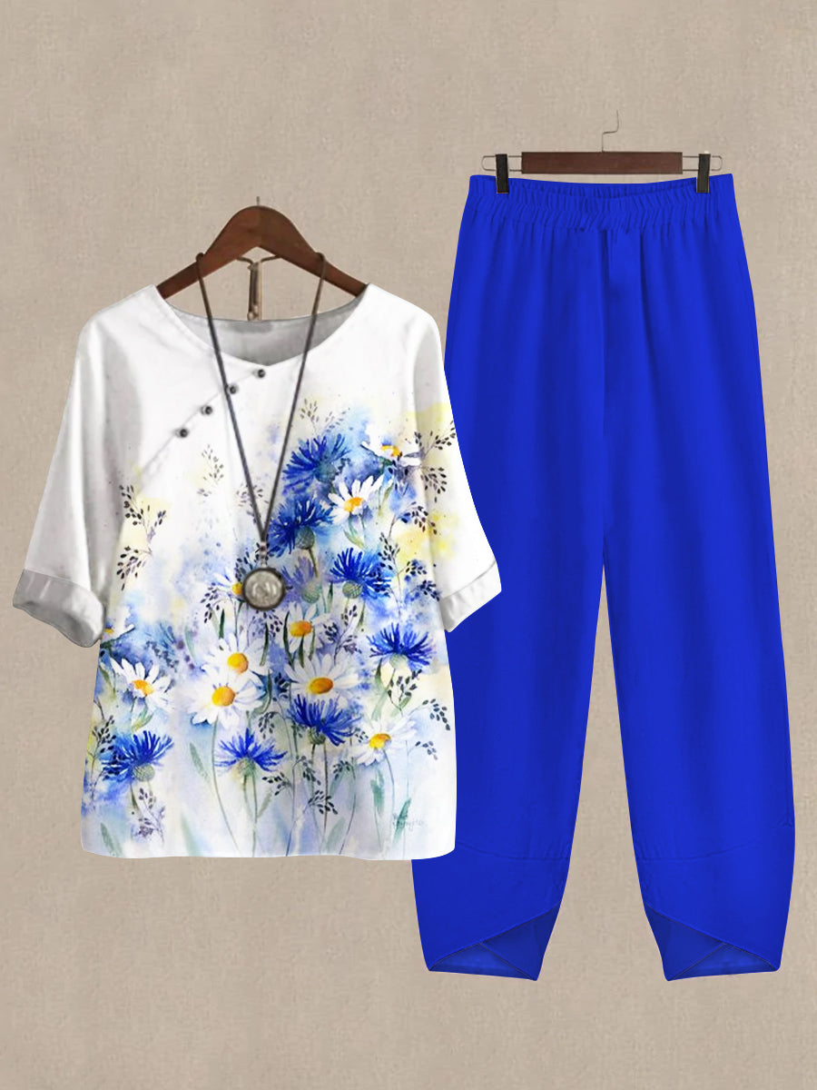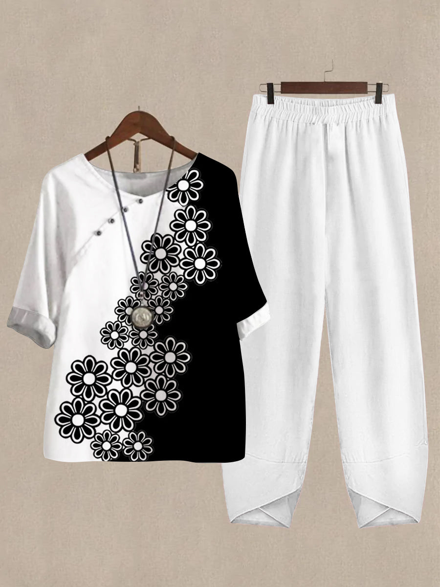 Linen Casual Women's Flower Print Two Pieces Set