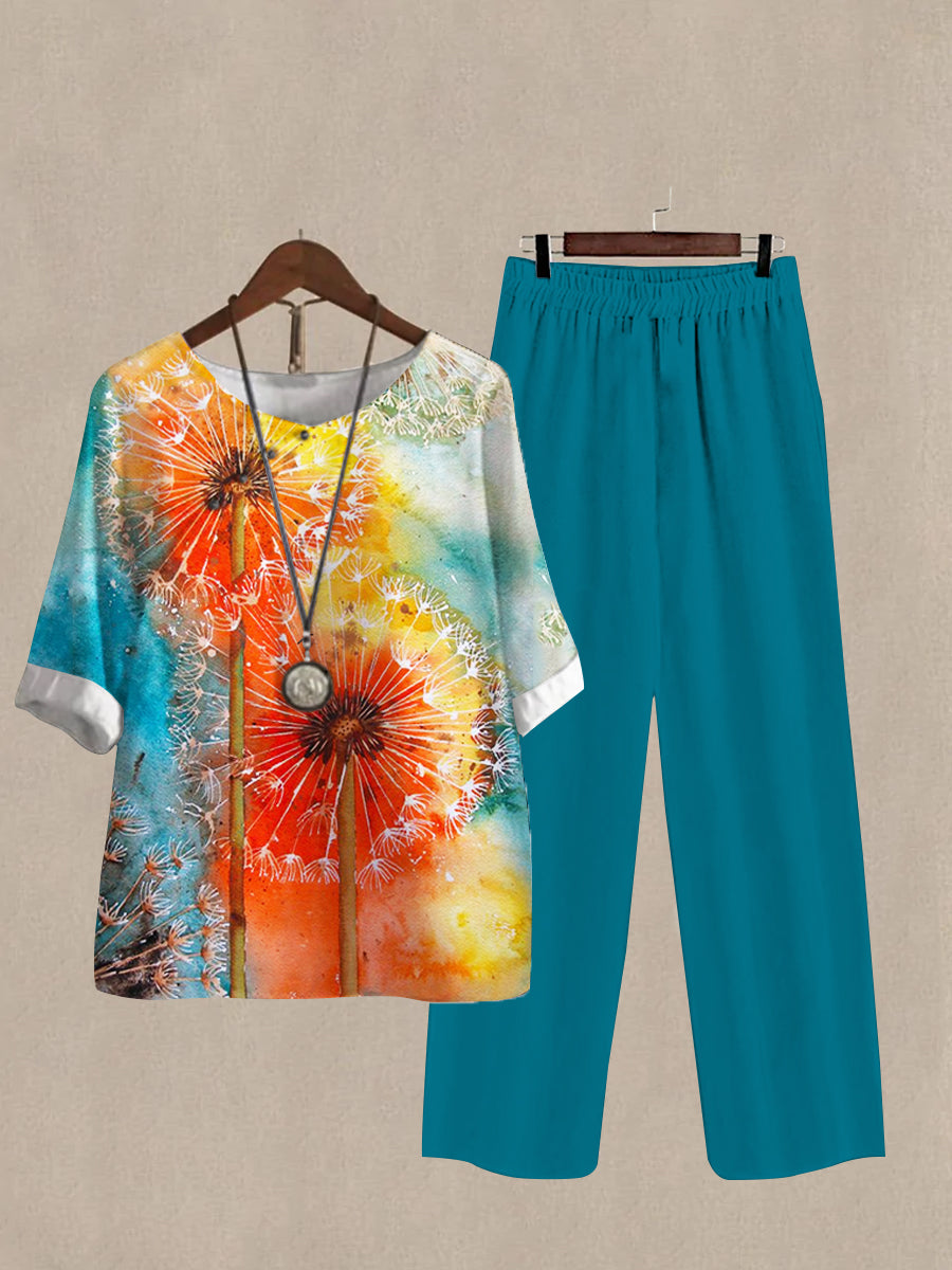 Women's Dandelion Print Half Sleeve Top And Casual Pants Linen Two Pieces