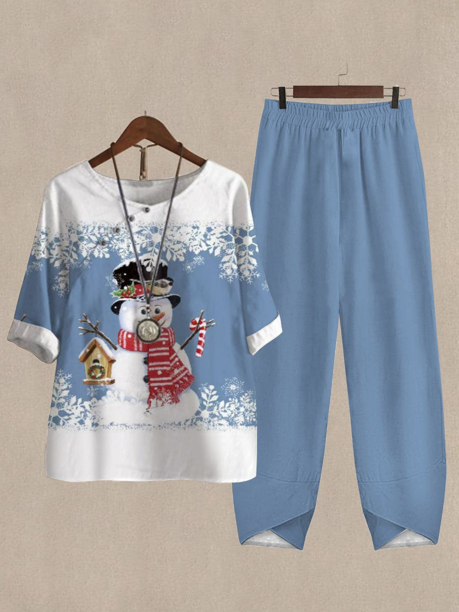Christmas Cartoon Snowman Print Casual Two Piece Set
