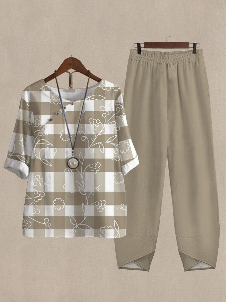 Vintage Plaid Floral Print Casual Two-piece Suits