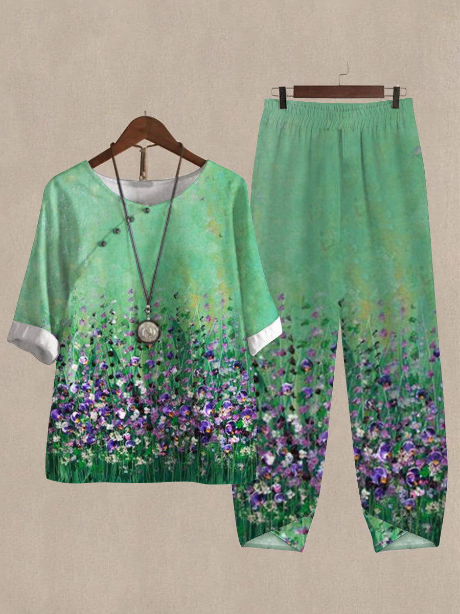 Women's Watercolor Painting Print Half Sleeve Top And Wide Leg Pants Linen Two Pieces