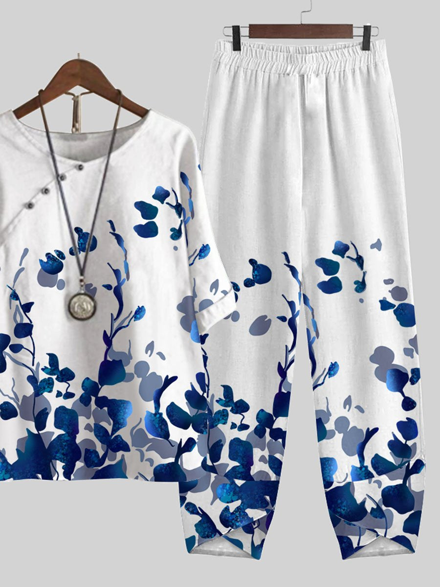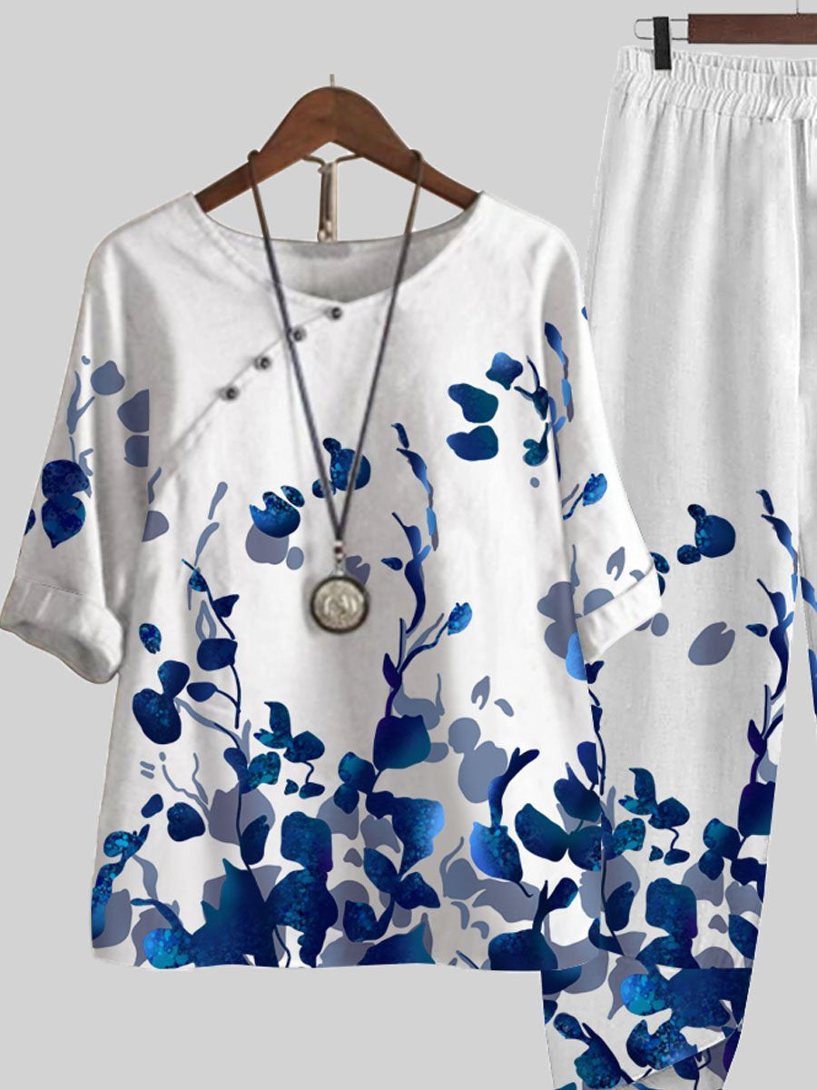 Blue Leaf Print Top And Pants Two-piece Suits