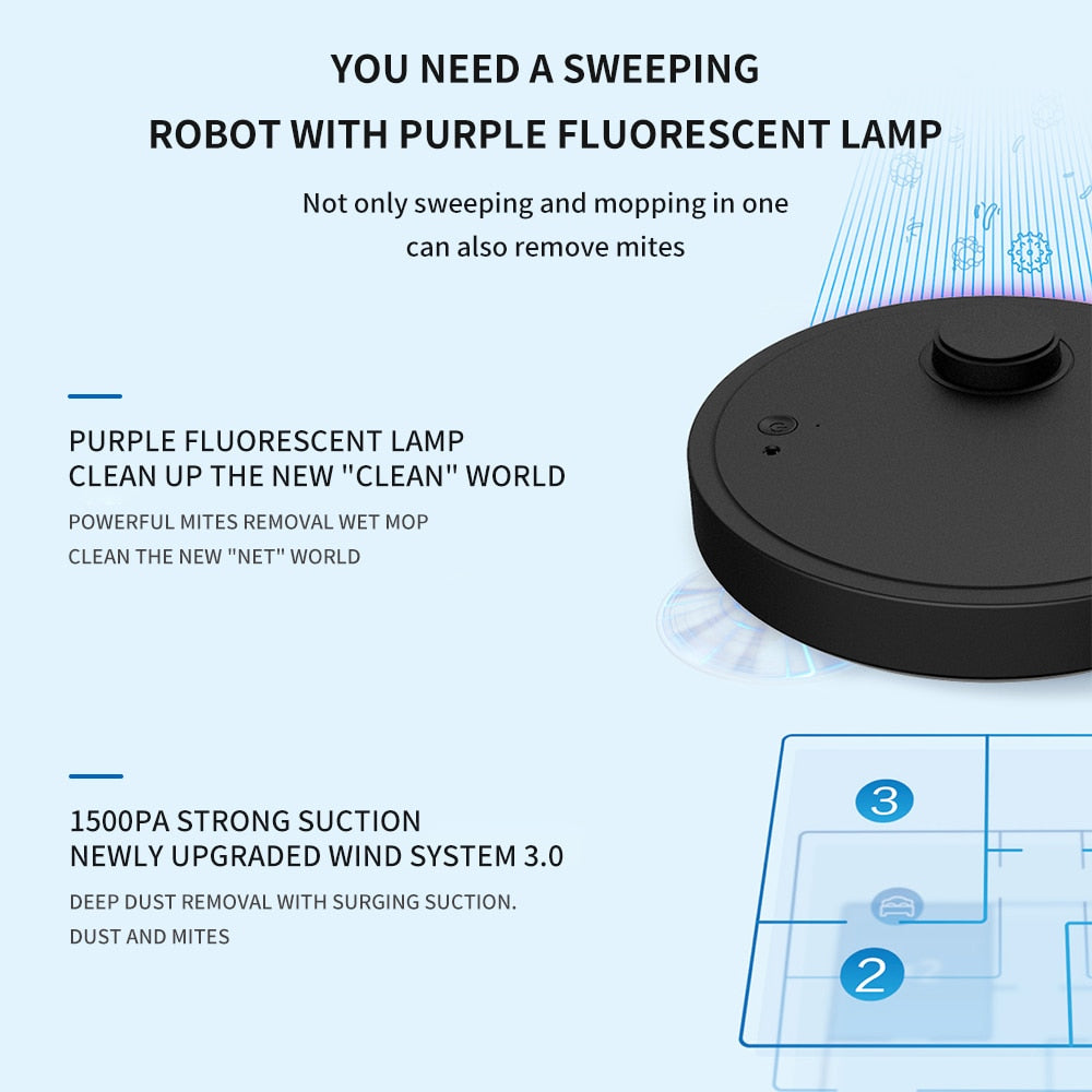 Purple Fluorescent Lamp : The Smart Robot's purple fluorescent lamp function is designed to sterilize areas and destroy live mites. This is a great feature for allergy sufferers and households with pets!