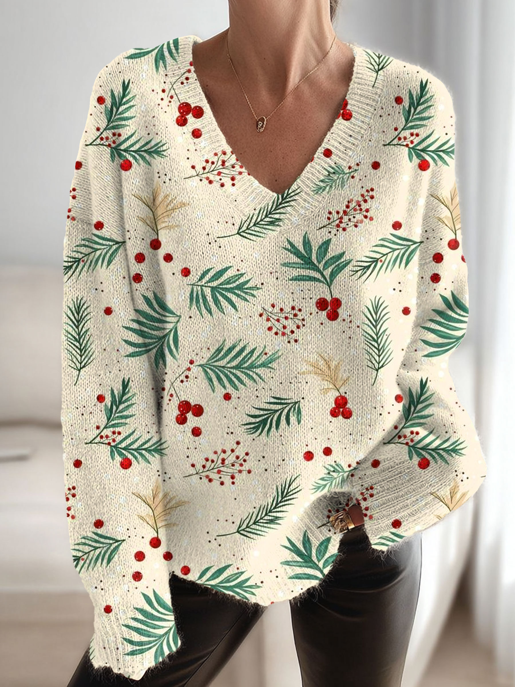 Christmas Art Print Knit V-neck Pullover Sweater