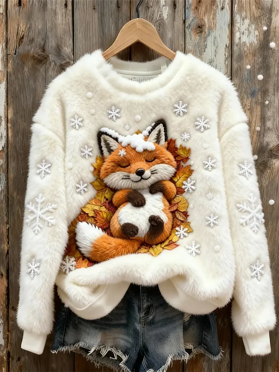 Christmas Cute Fox Art Print Casual Plush Sweatshirt