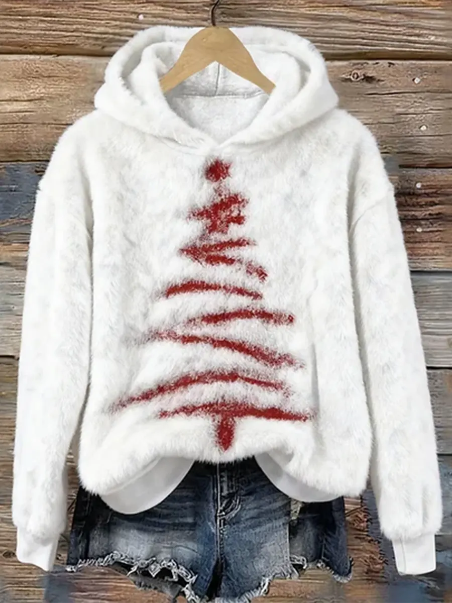 Christmas Tree Art Print Casual Plush Hood Sweatshirt