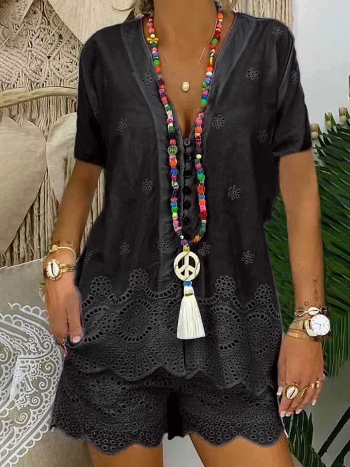Product: Fashionable Solid Color Hollow Short Sleeve Casual Suit