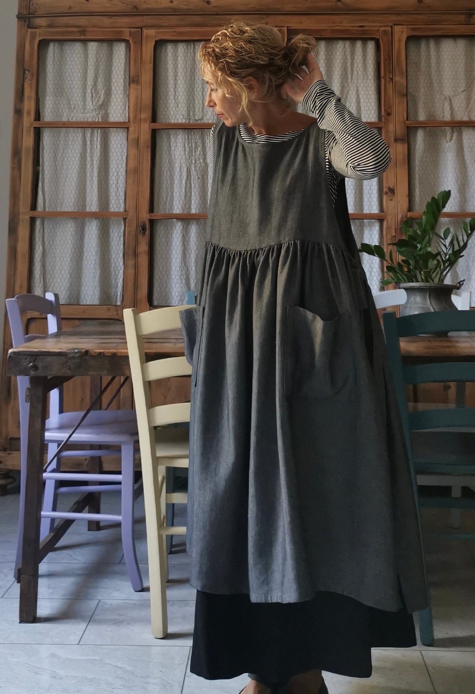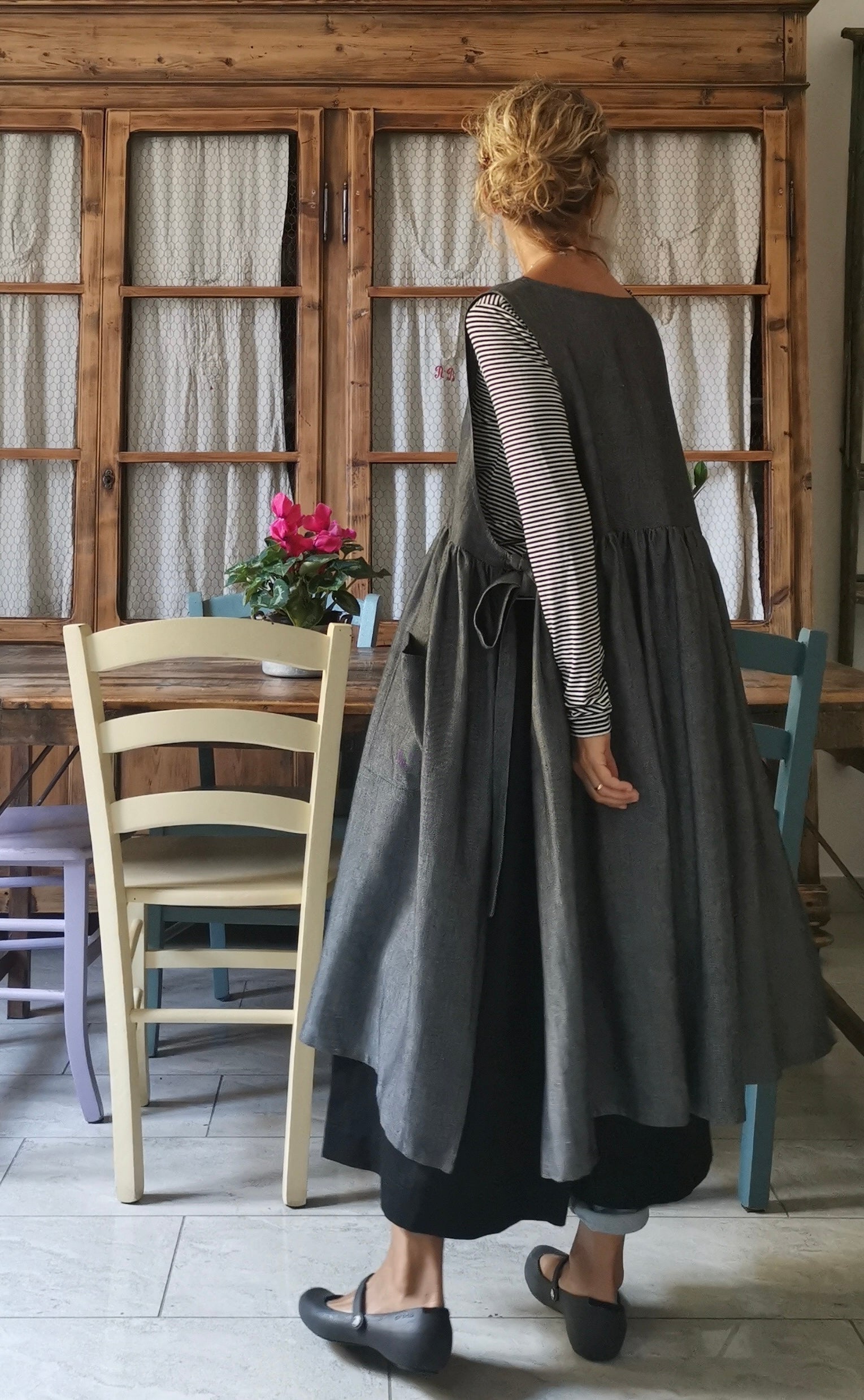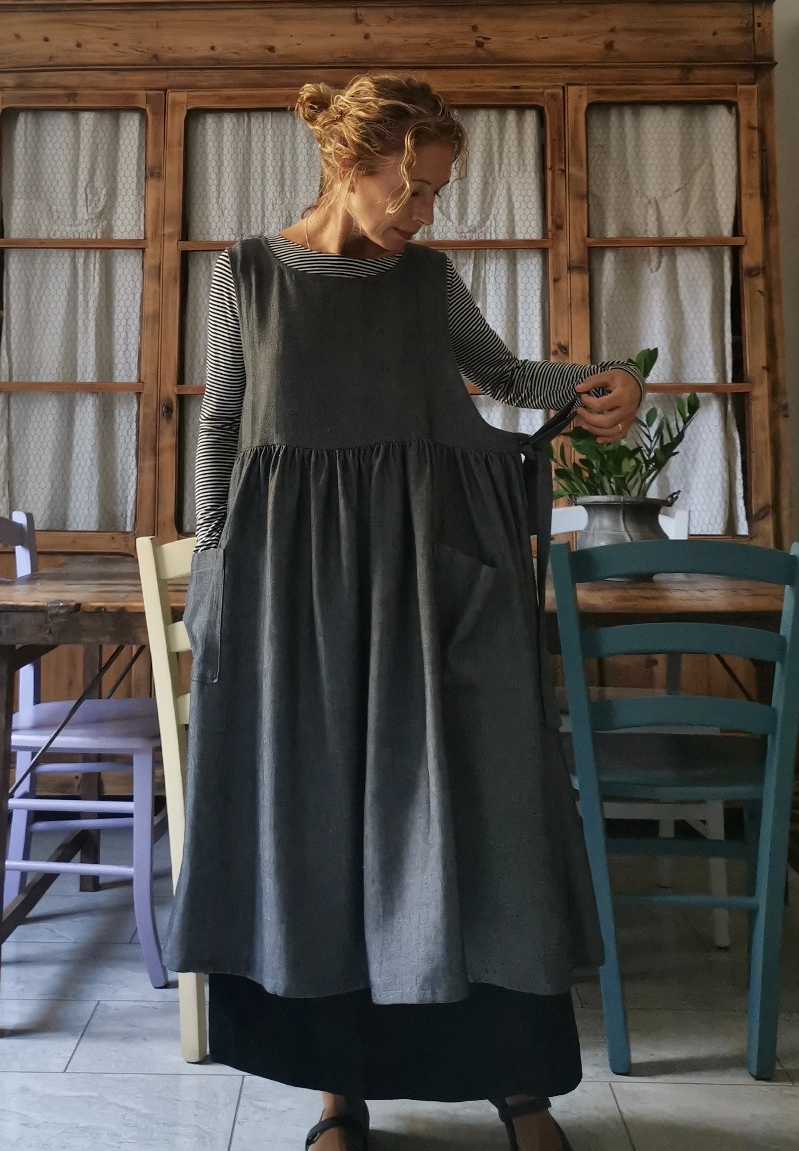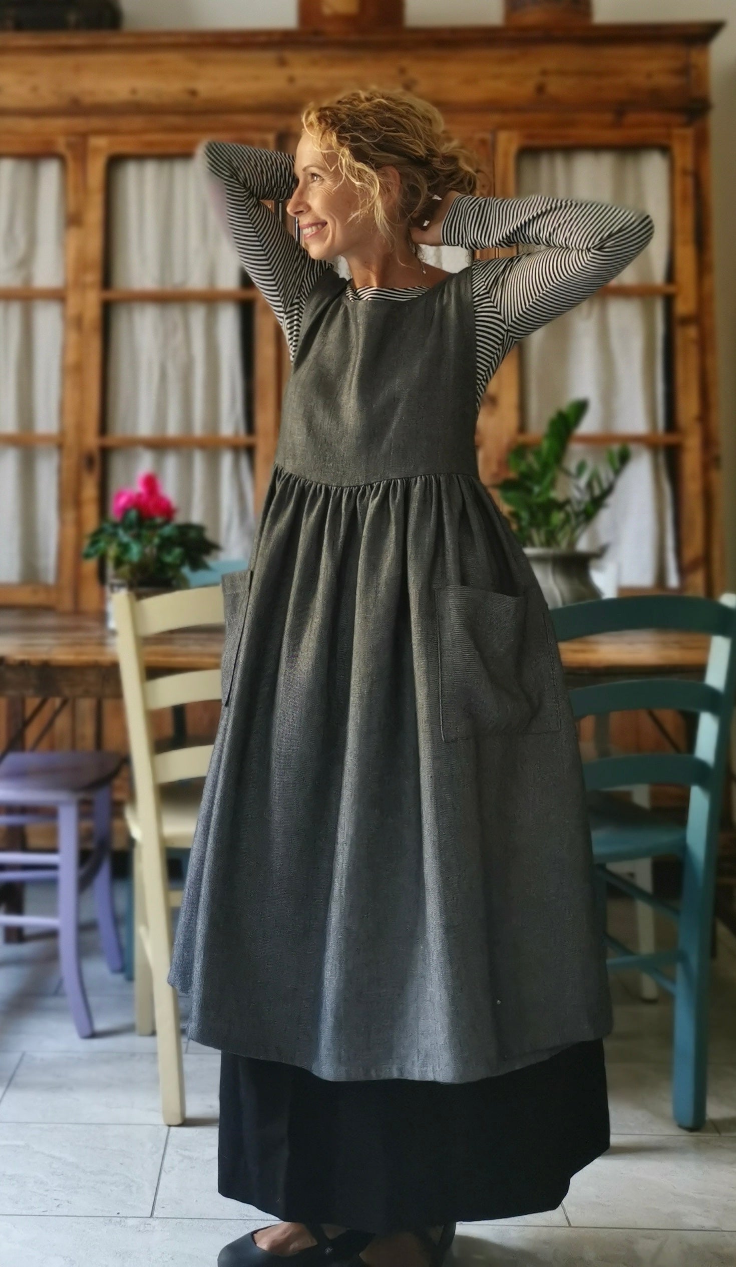 Grey Herringbone Linen Apron with Pockets