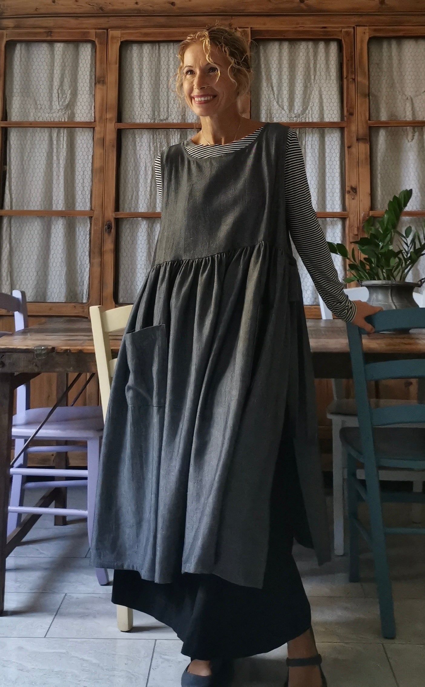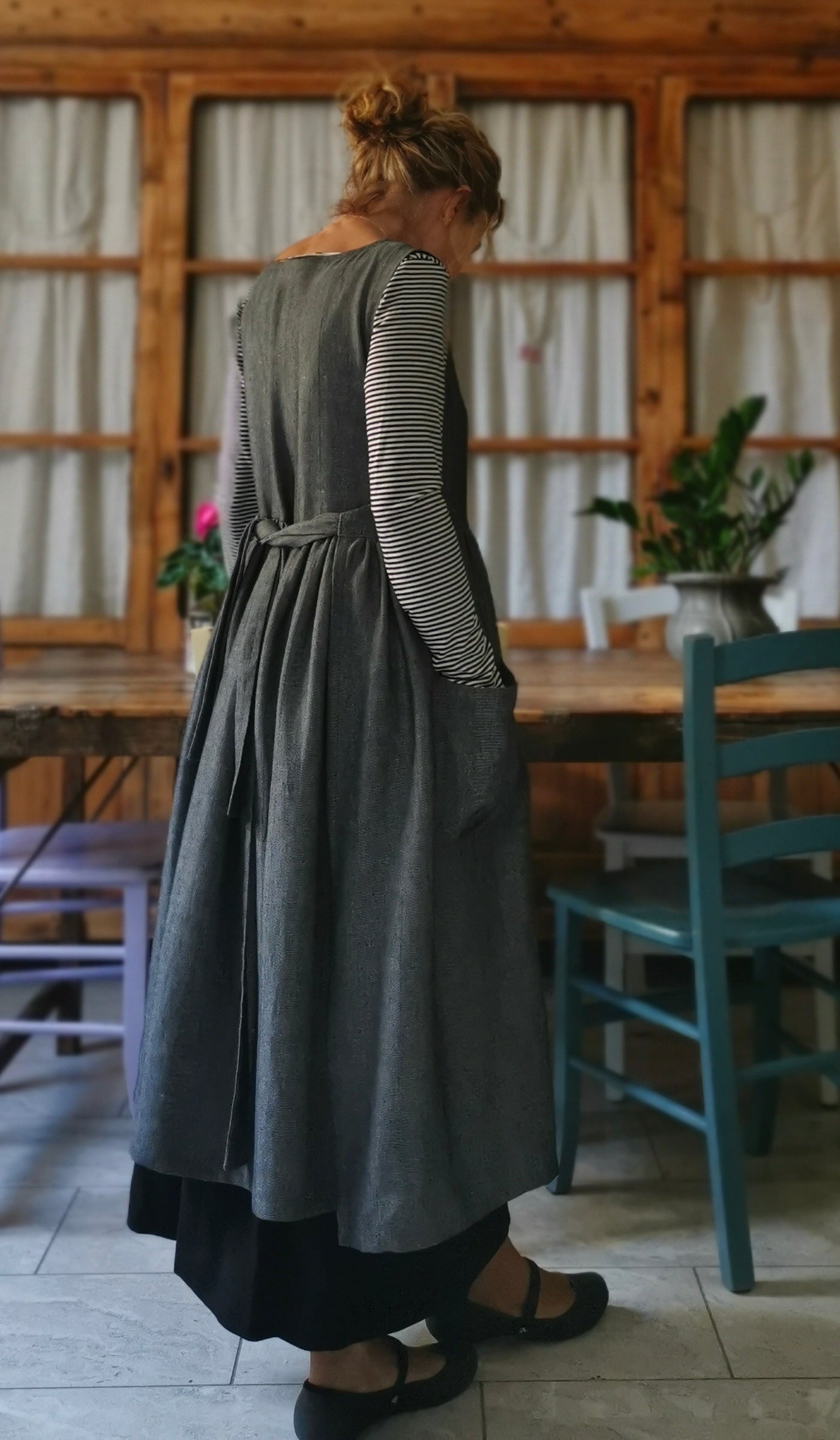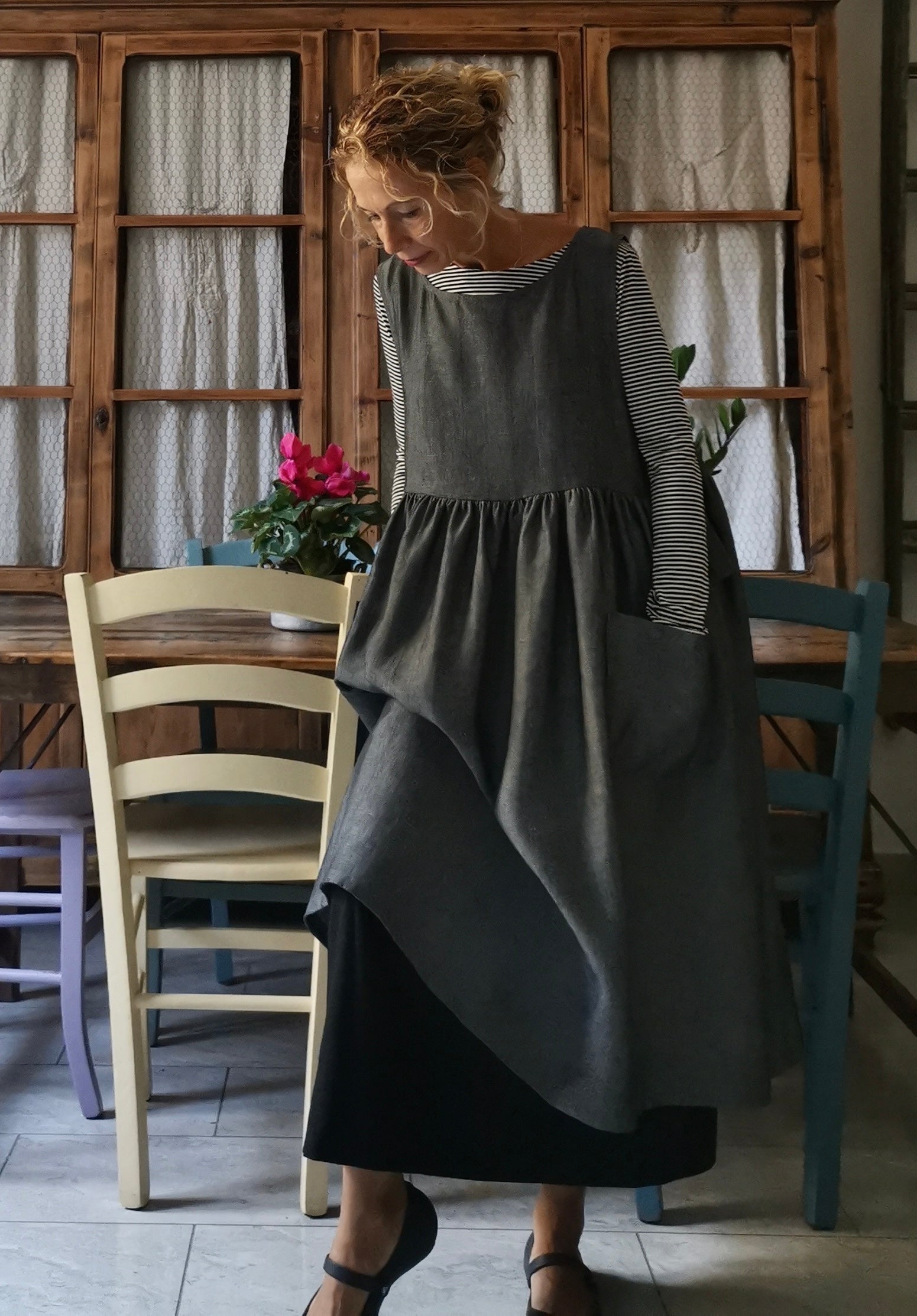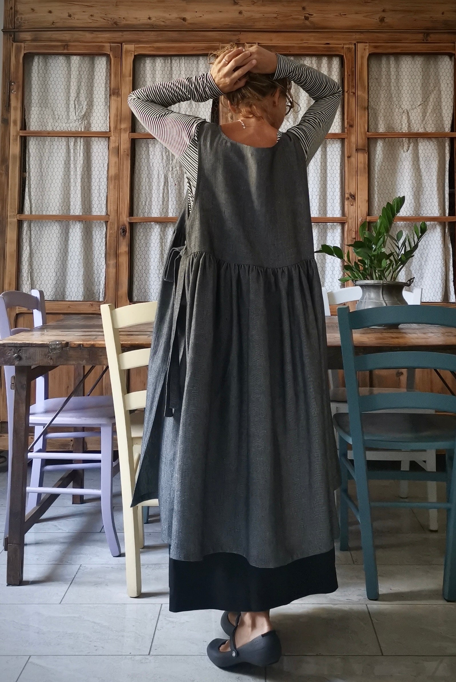 Grey Herringbone Linen Apron with Pockets