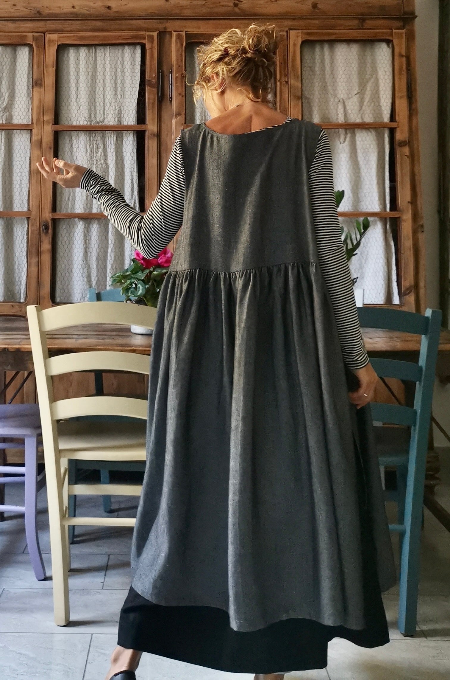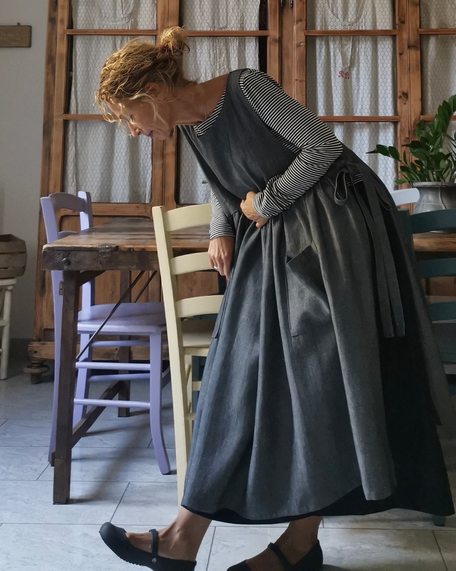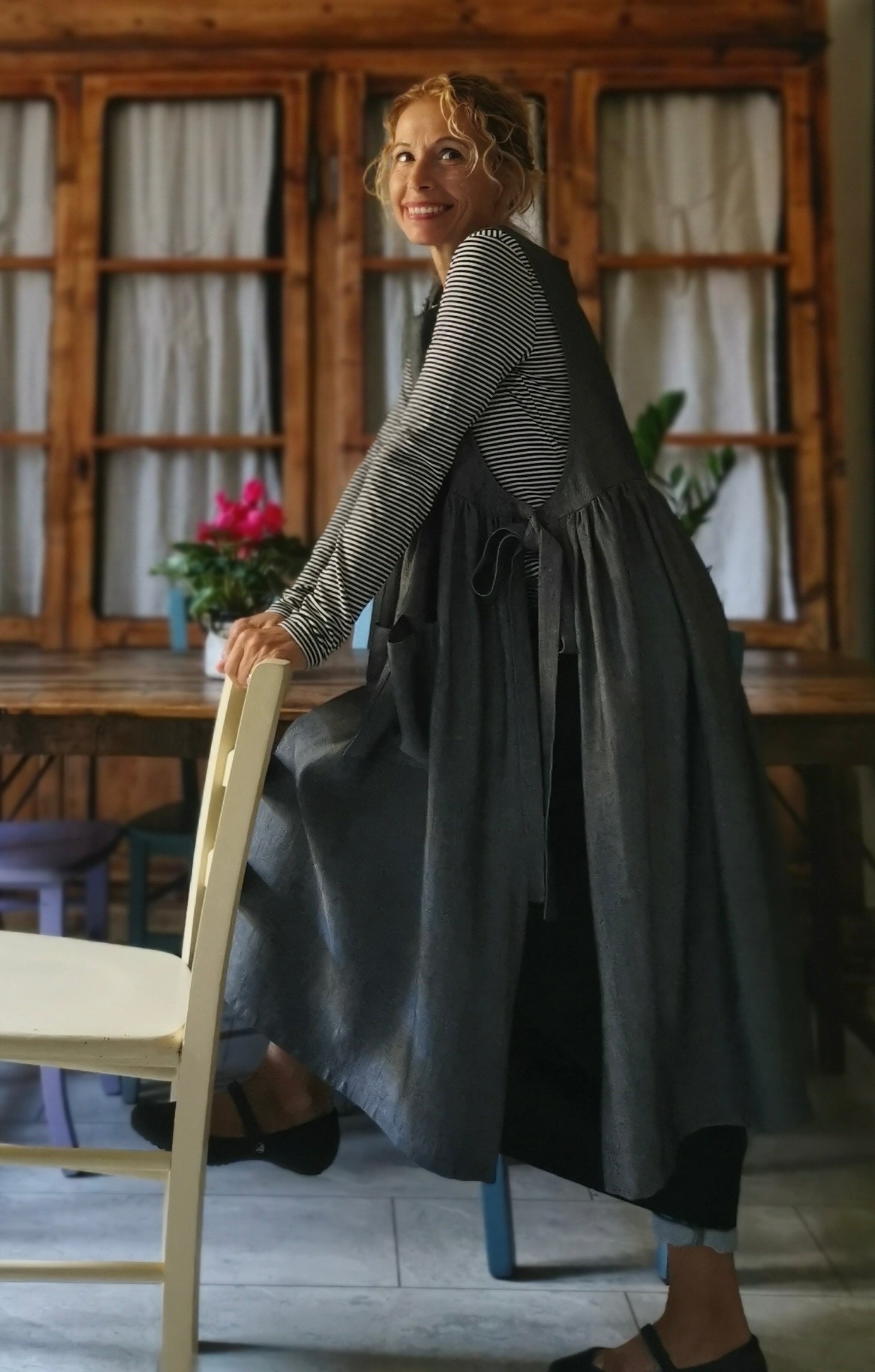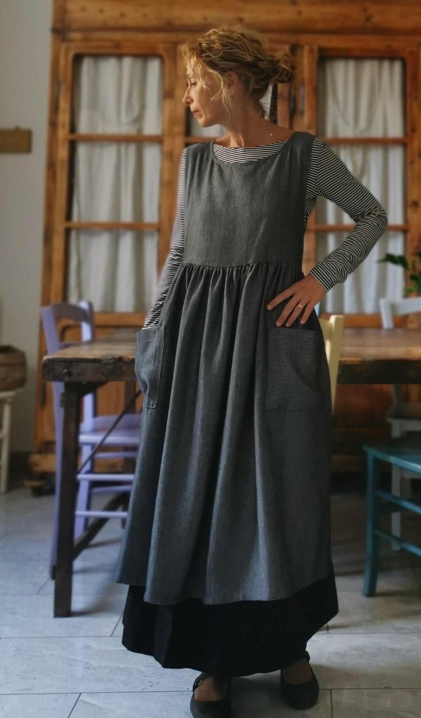 Grey Herringbone Linen Apron with Pockets