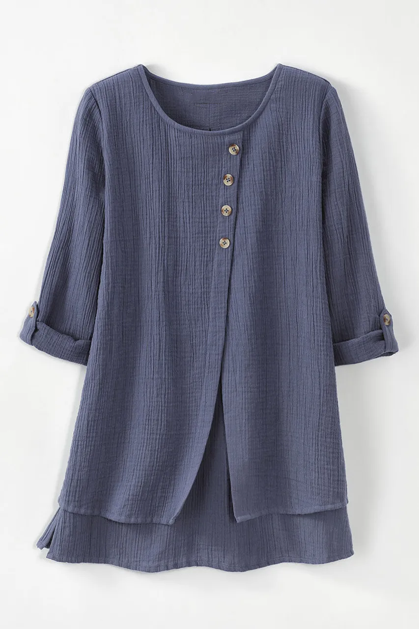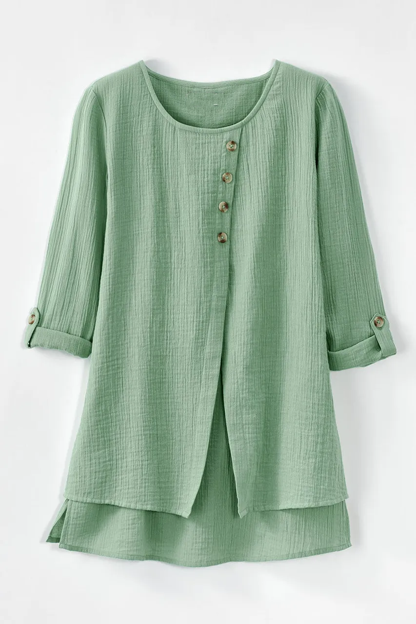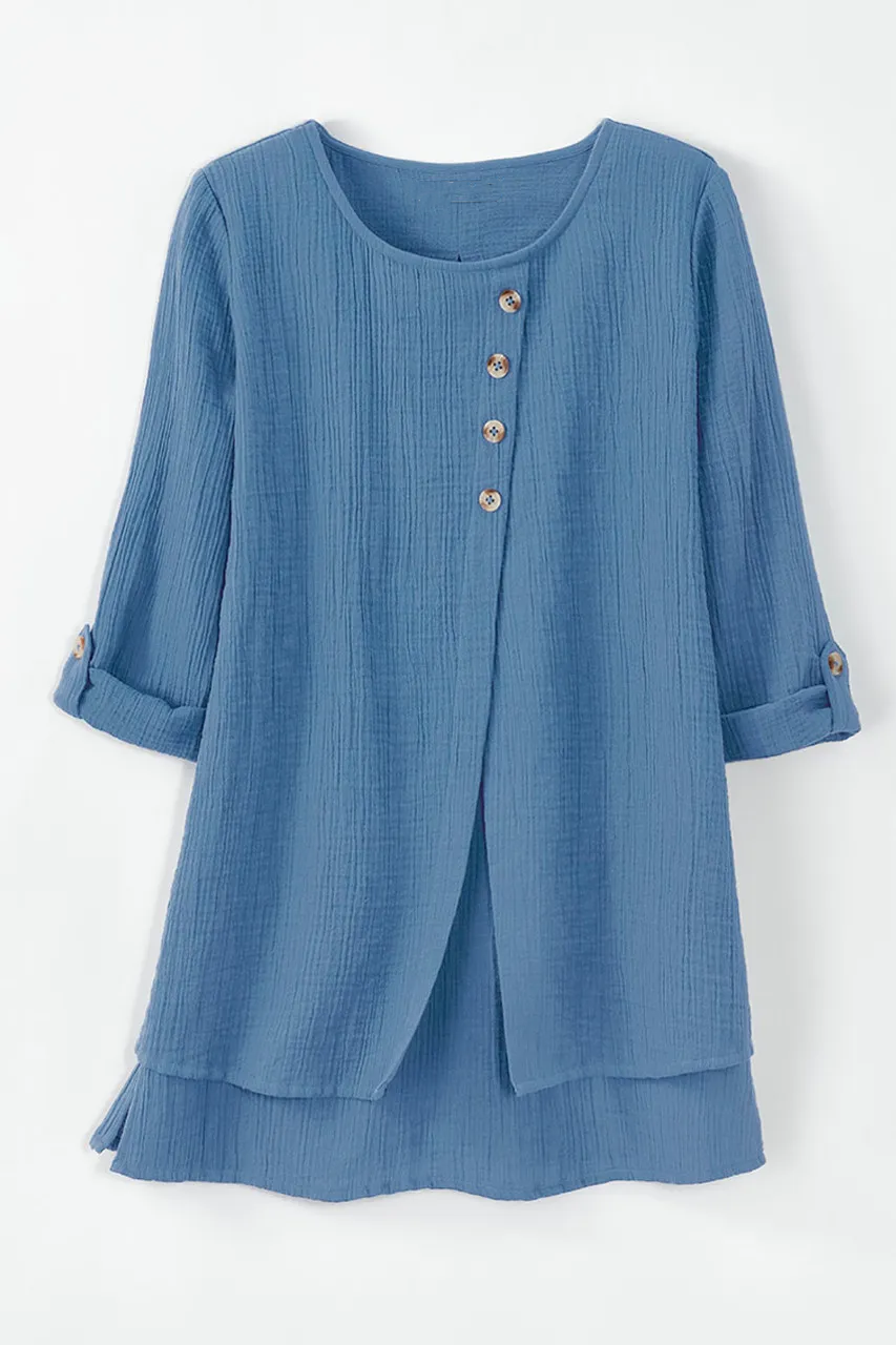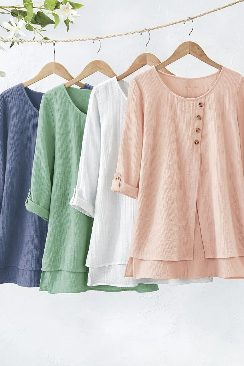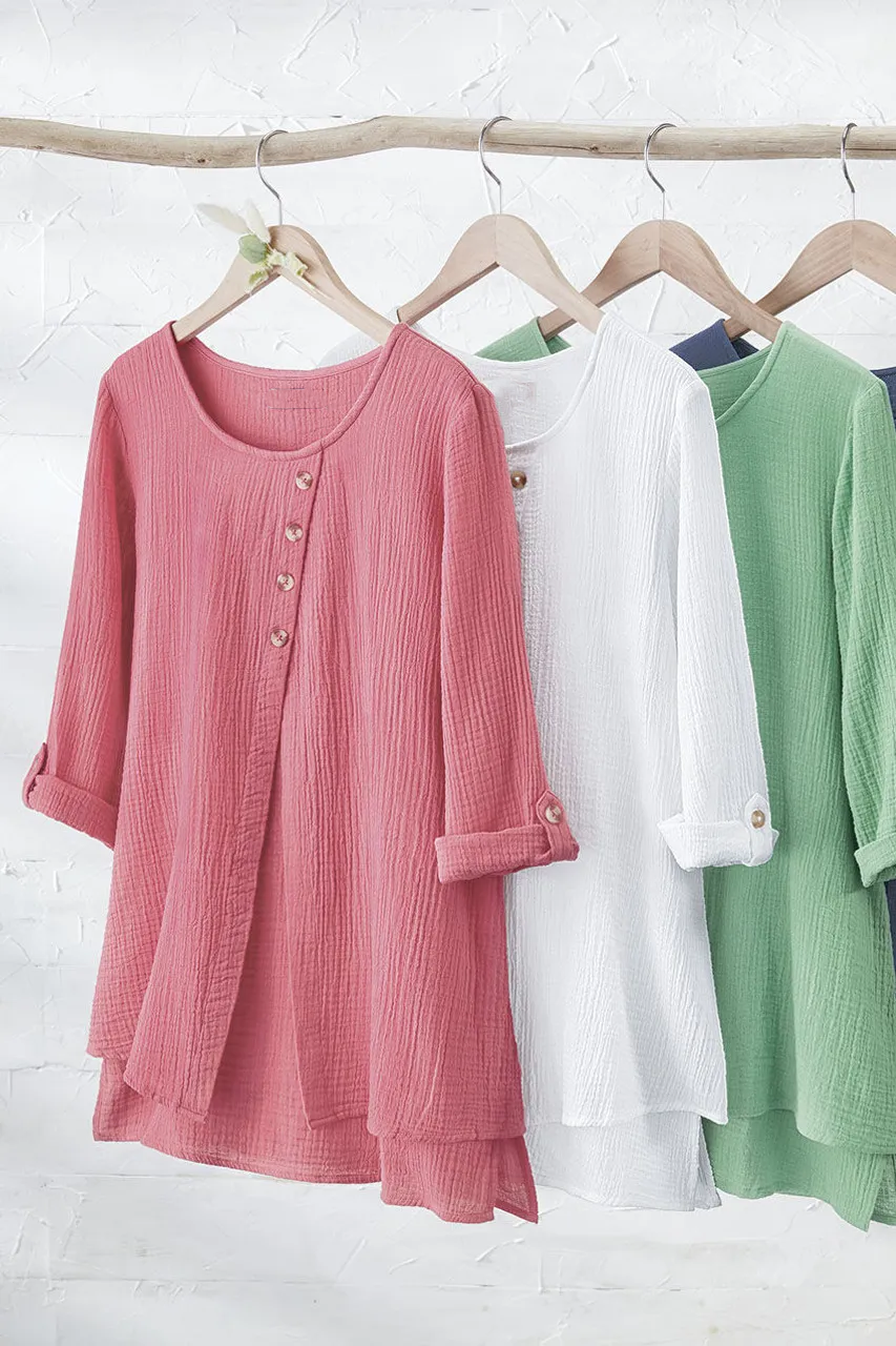Breezy as summer vacation, with artfully refined details. Layers of pure cotton crinkled gauze are accented with faux coconut shell buttons and a split-front top layer.