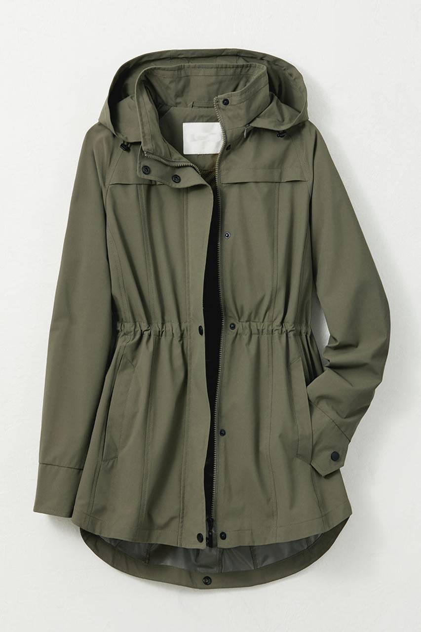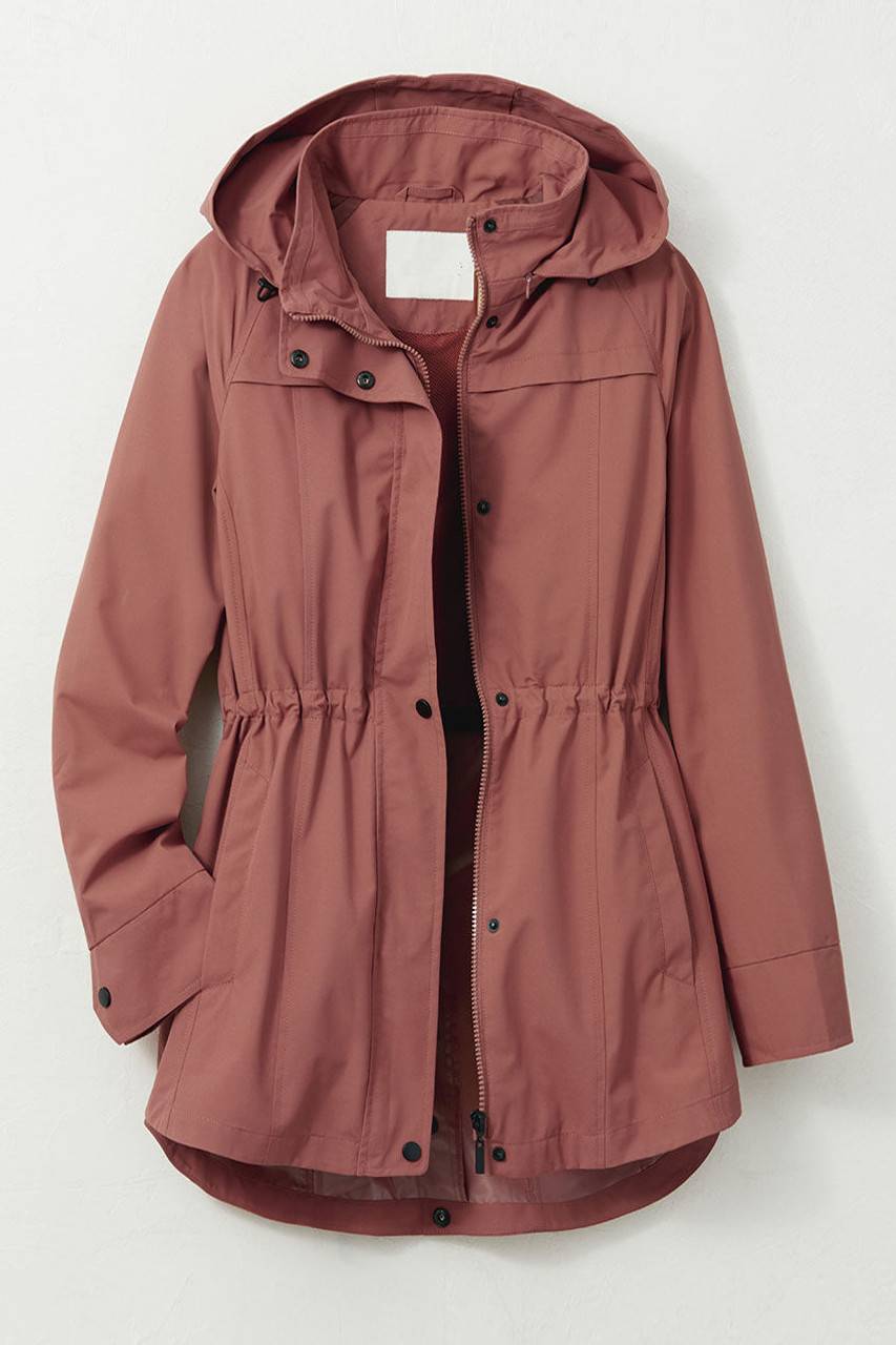 Take a little weather protection wherever you go. This rain-resistant jacket rolls into its own zippered compartment for easy packing, while the hood zips into the collar for custom style. Zip-and-snap front, inner drawstring waist, two slant pockets.