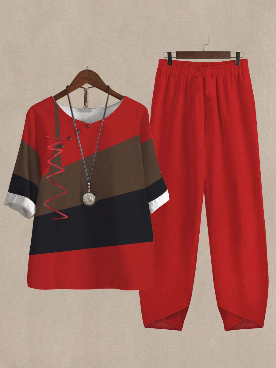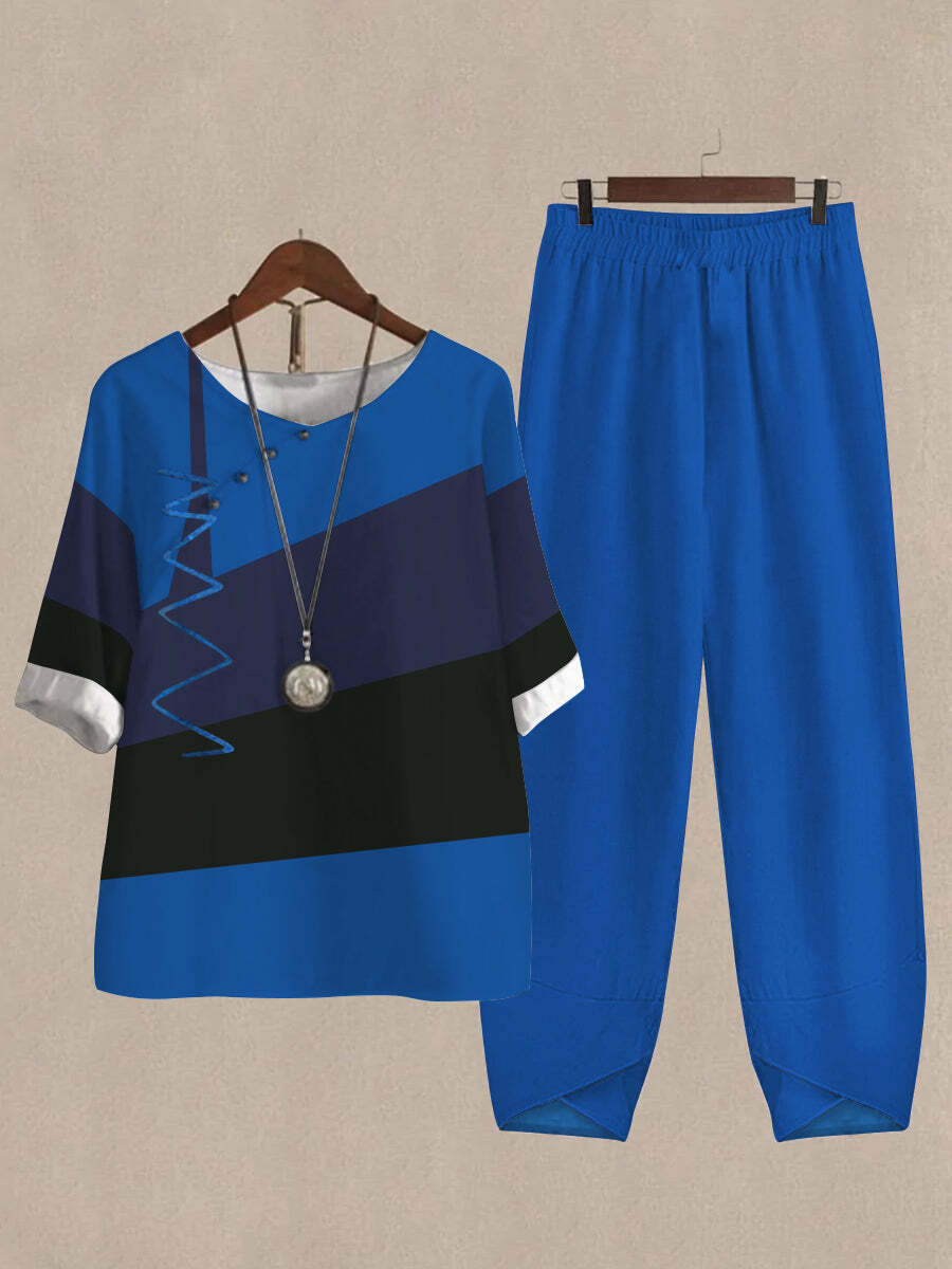 Linen Casual Women's Color Block Print Two Pieces Set