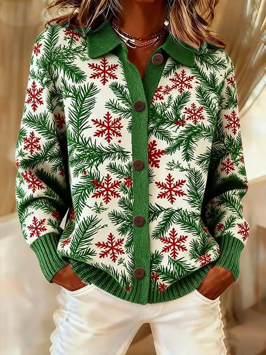Multicolor Retro Christmas Art Print Knitted Lapel Cardigan Sweater