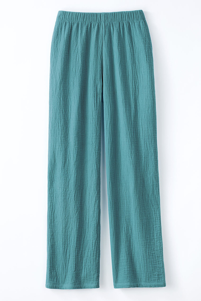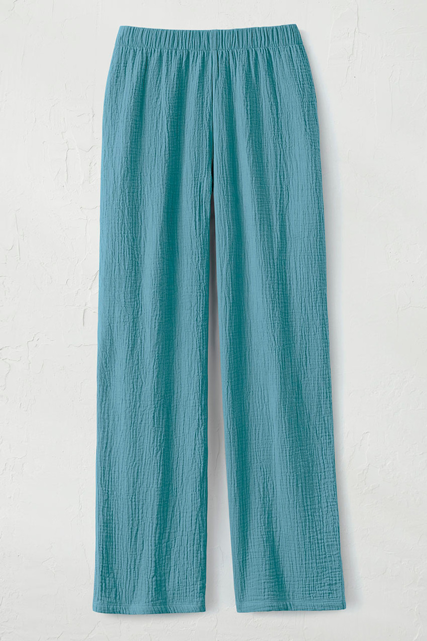 These pants really do make summer a breeze. They’re light, easy and versatile in crinkled cotton gauze, with a full elastic waist. Imported.