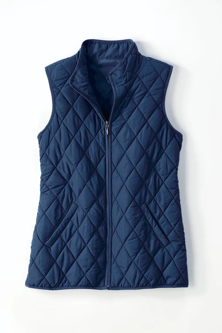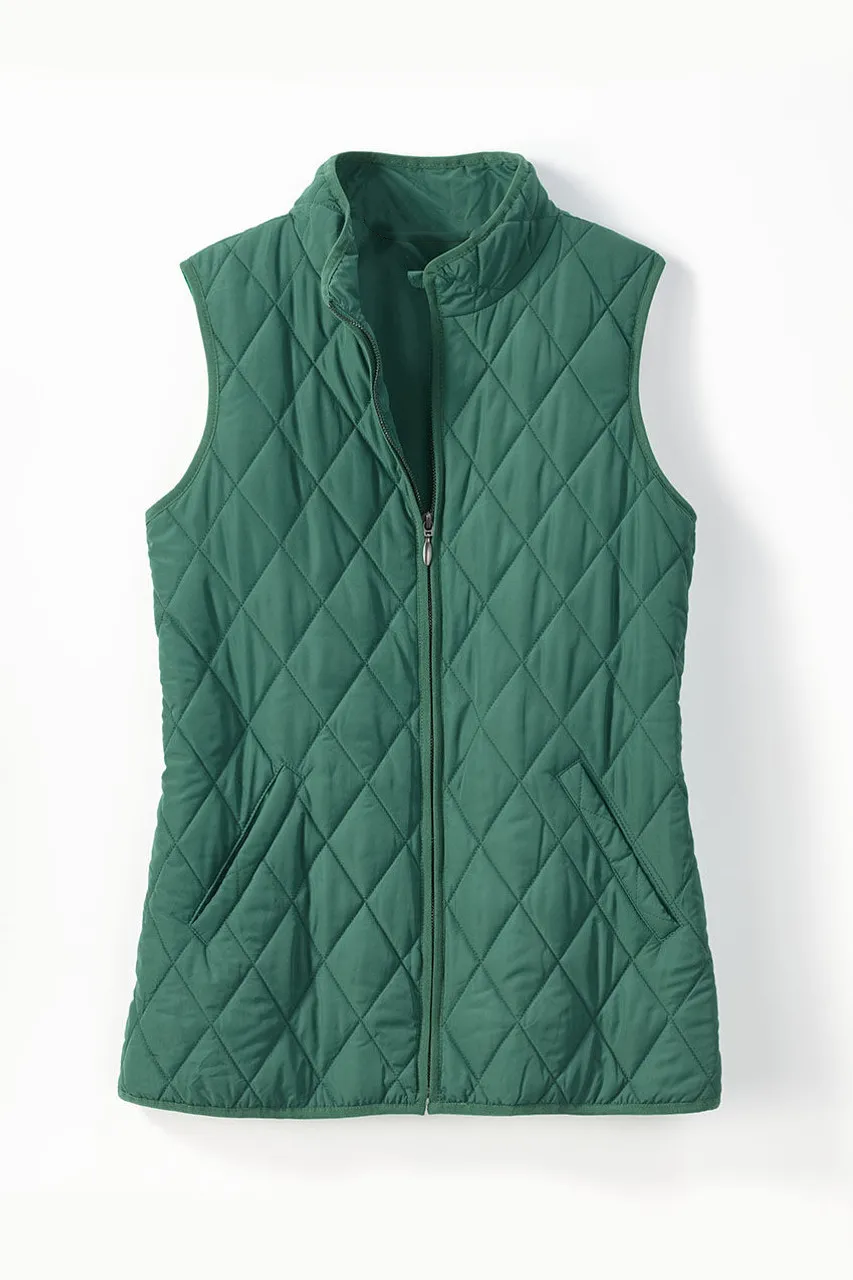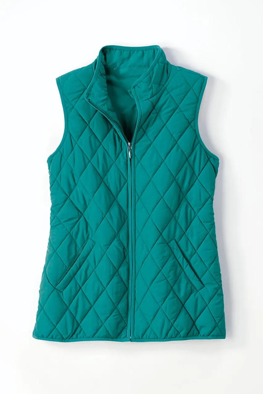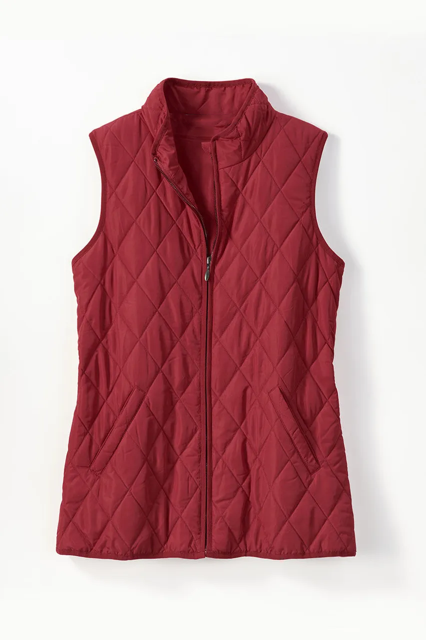 Our lightweight quilted vest is ideal for in-between days or for adding a pop of color – newly updated with a longer length and back elastic to gently shape the waist. Zip front, with a fabric zipper guard at the neck to protect your chin. Side pockets plus two inside pockets.