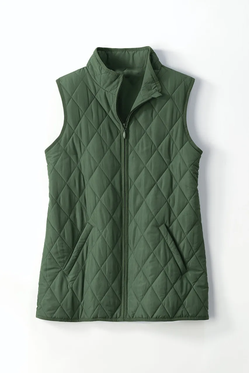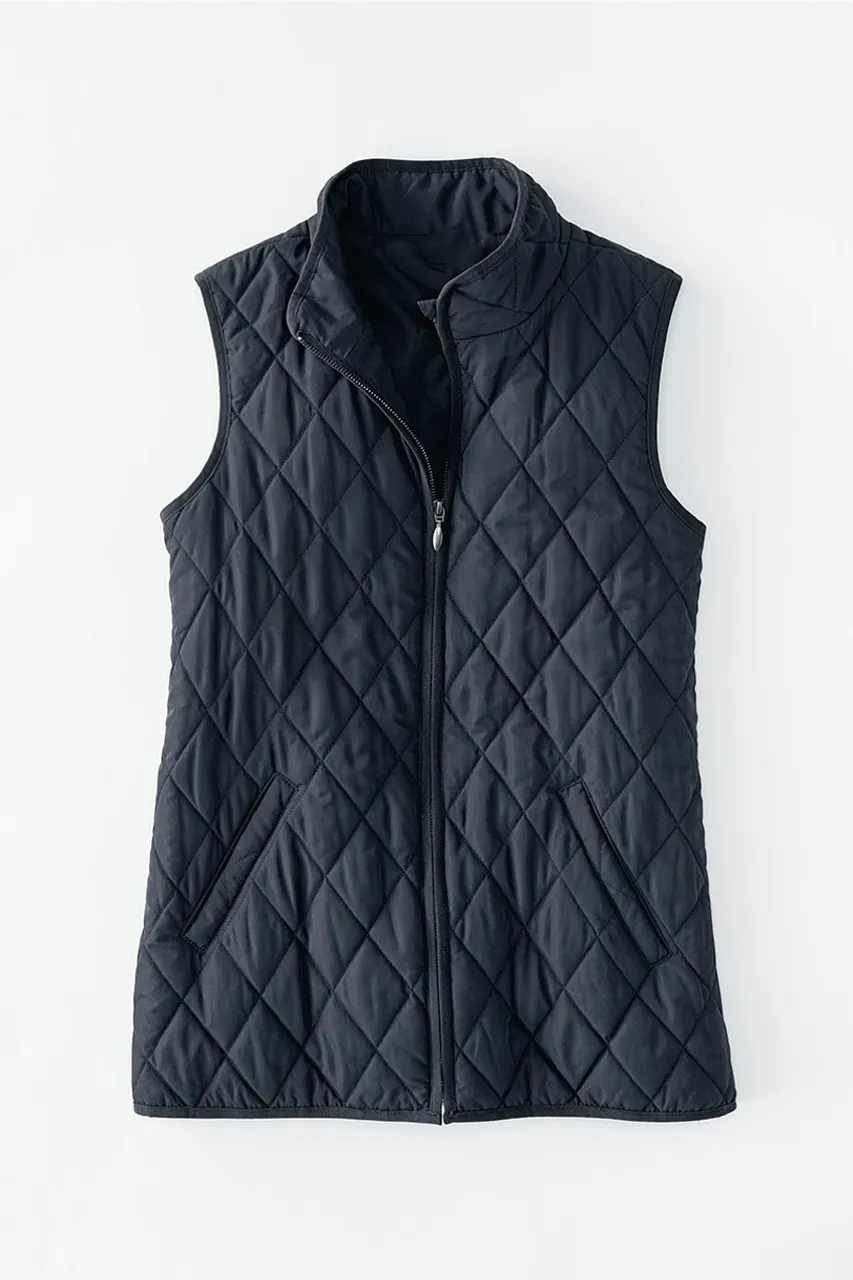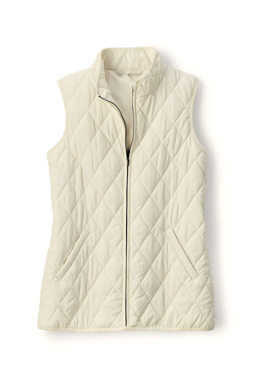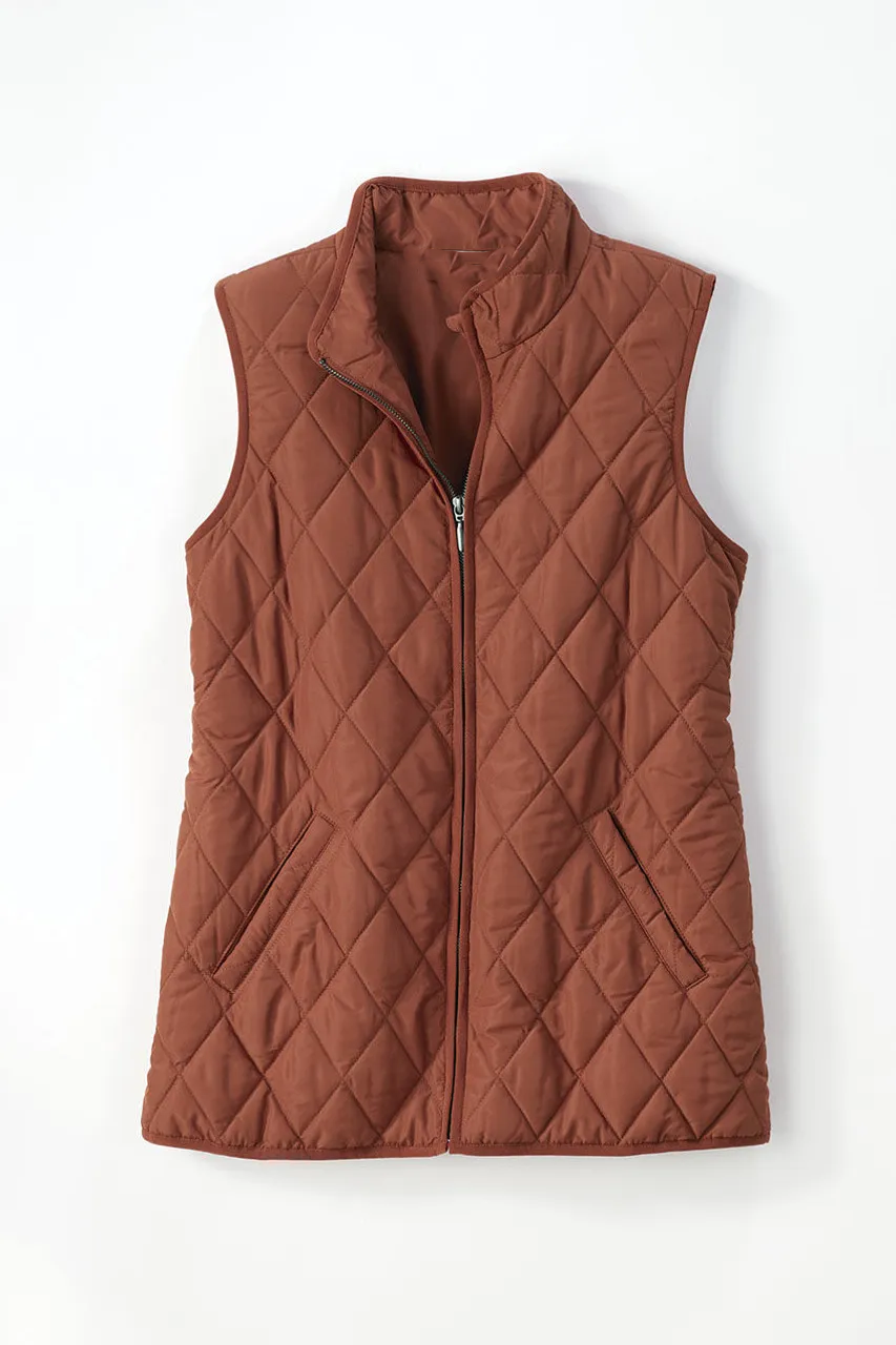 Our lightweight quilted vest is ideal for in-between days or for adding a pop of color – newly updated with a longer length and back elastic to gently shape the waist. Zip front, with a fabric zipper guard at the neck to protect your chin. Side pockets plus two inside pockets.