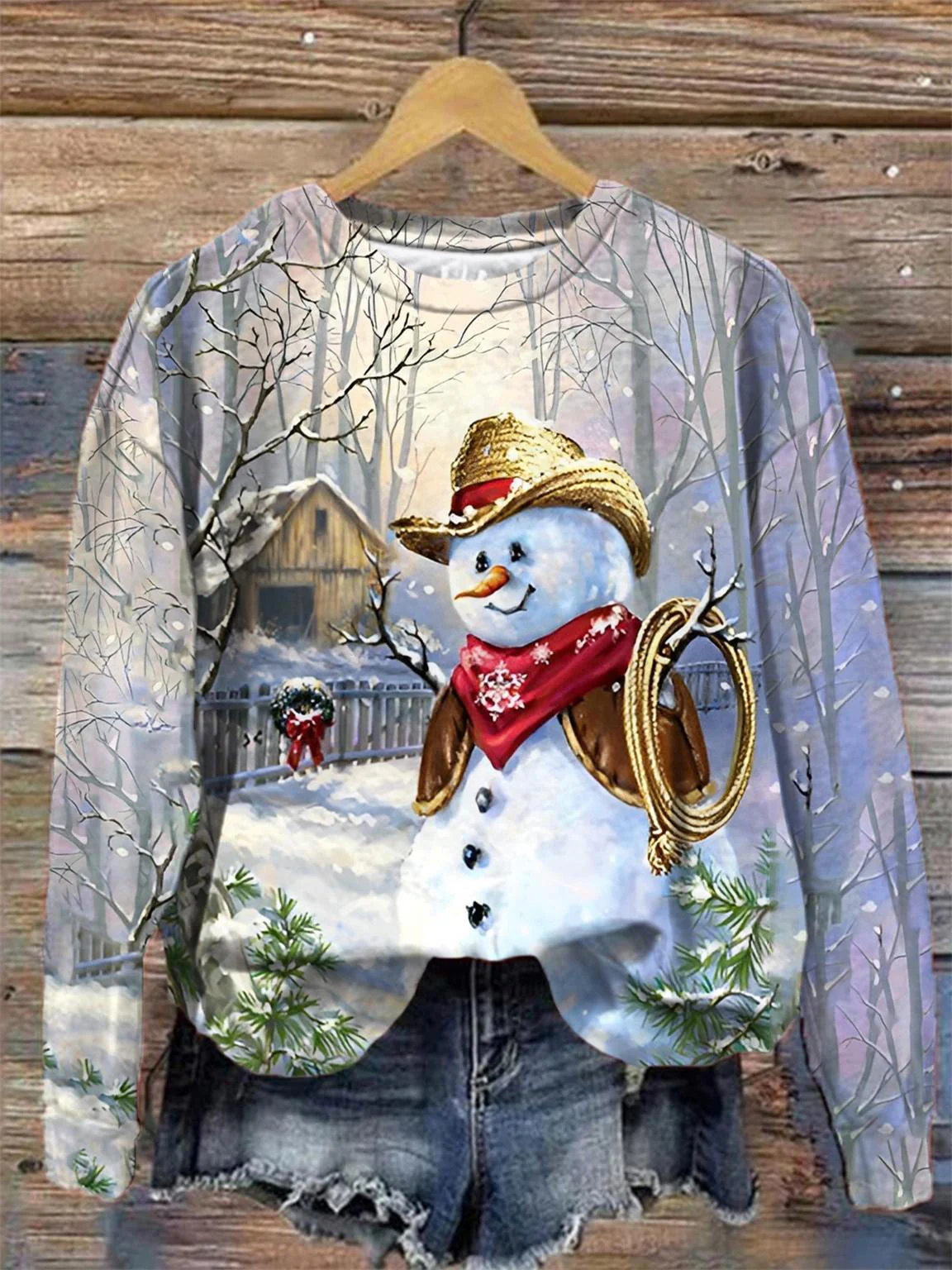 Western Cowboy Snowman Print Round Neck Top