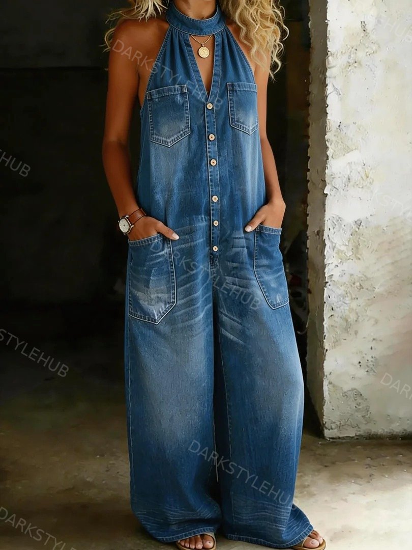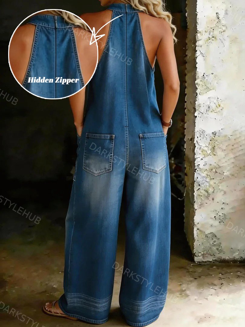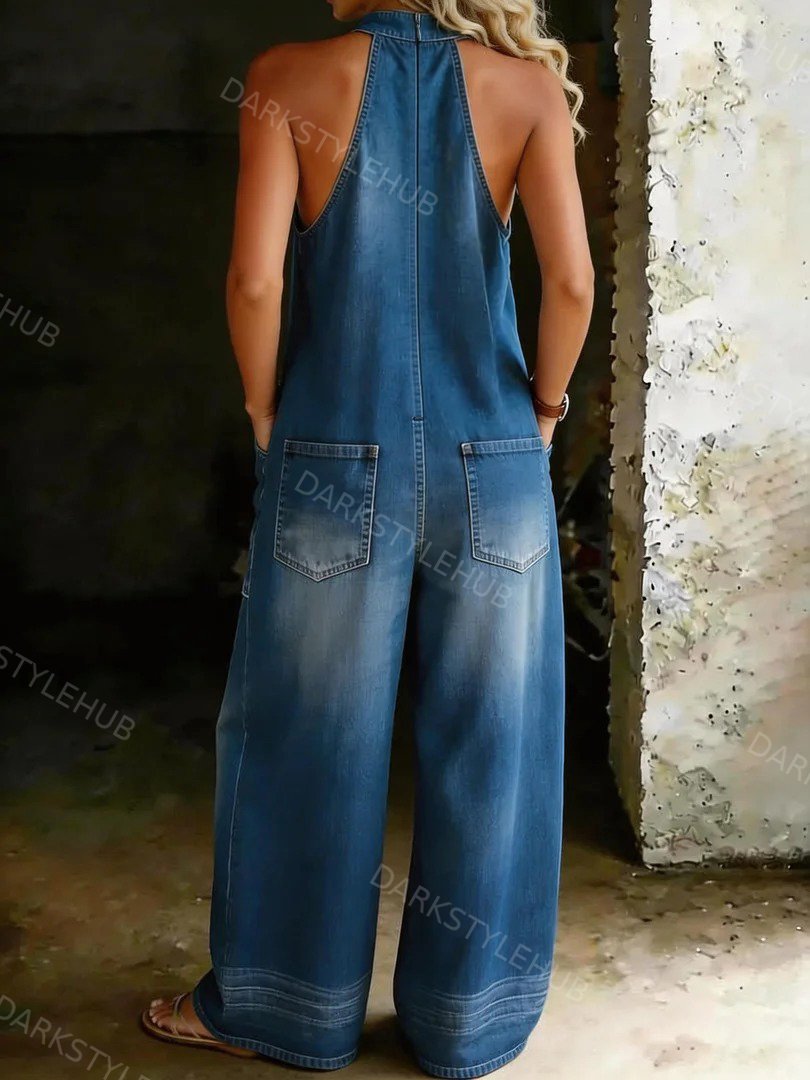 Women's Casual Loose Halter Neck Denim Jumpsuit with Hidden Zipper