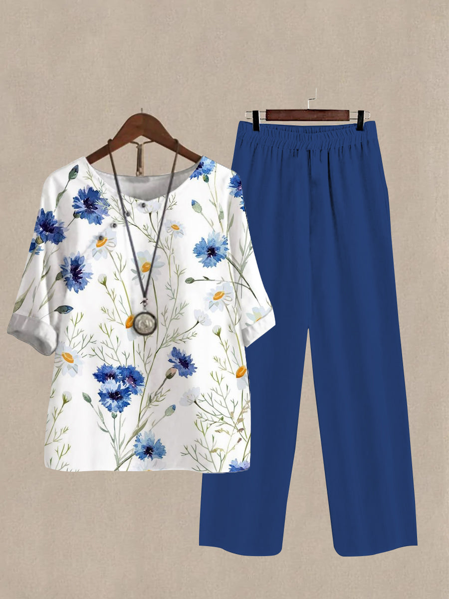 Women's Floral Print Half Sleeve Top And Wide Leg Pants Linen Two Pieces
